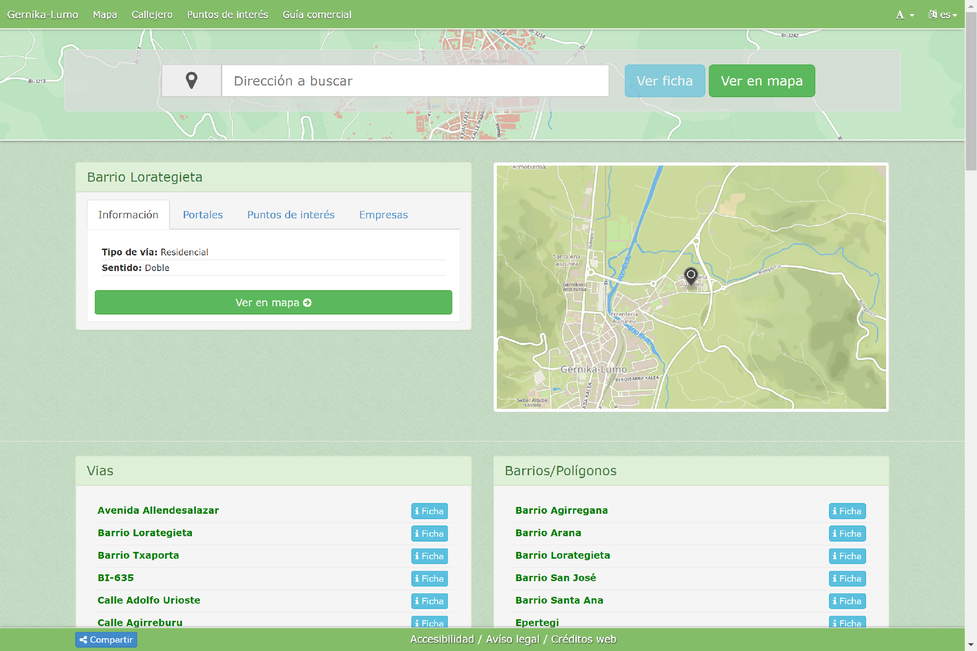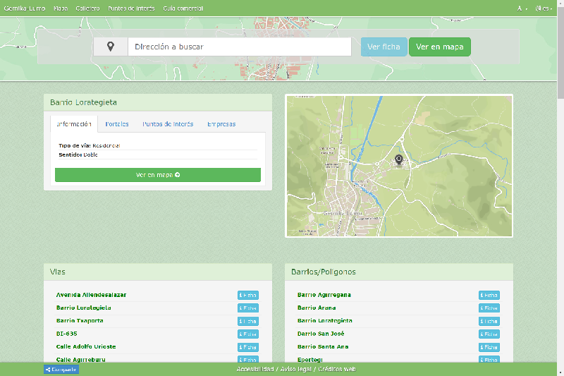 Un completo callejero que lista todas las vías del municpio así como zonas y barrios. Además, se pueden realizar búsquedas a nivel de portal, ubicando la localización exacta.